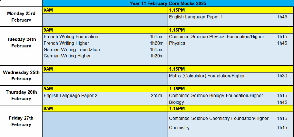 Year 11 February Core Mock Timetable